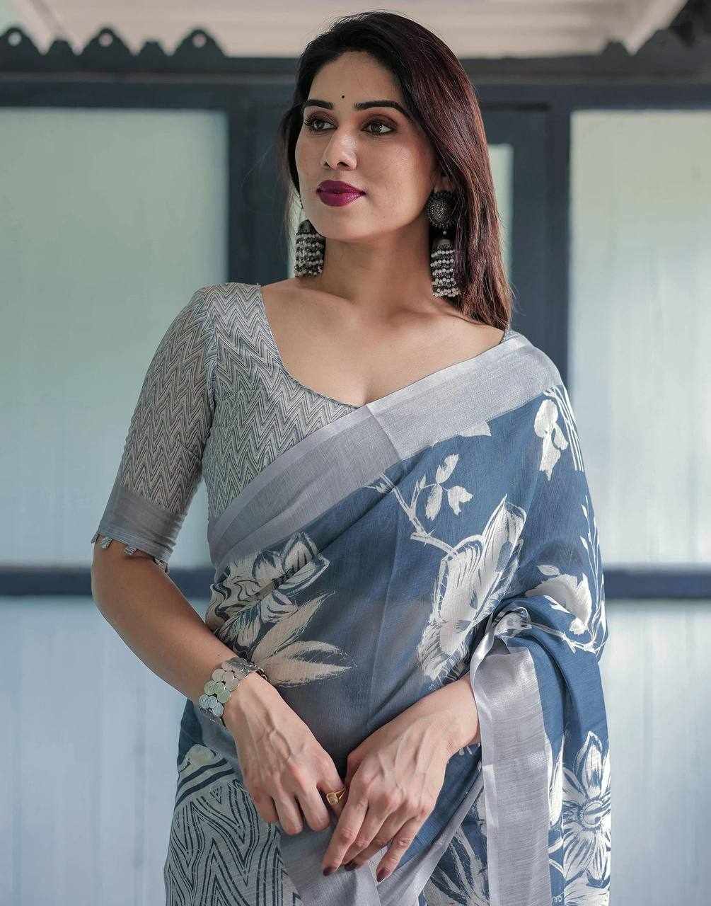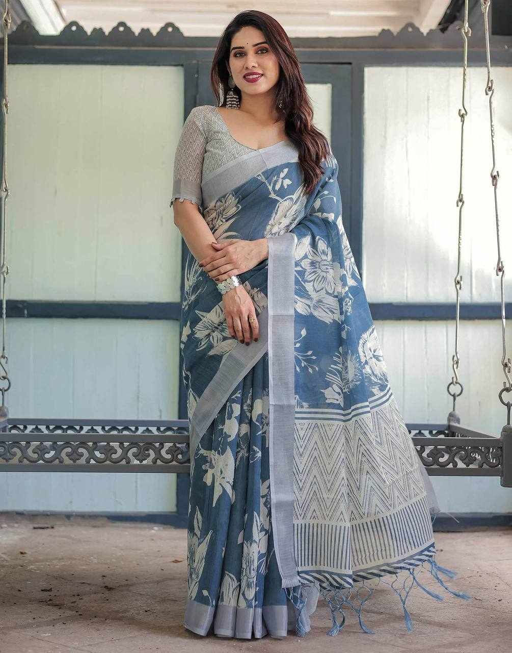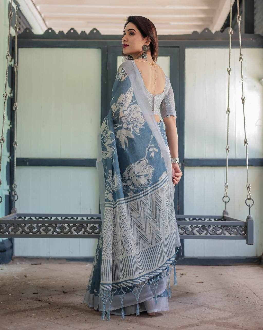Fabric: Silver Weaving Patta Linen Cotton Saree with beautiful digital print (5.5 meters)