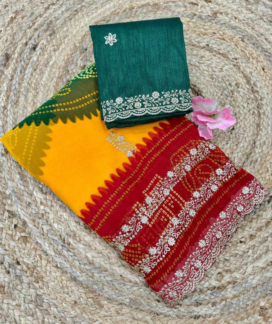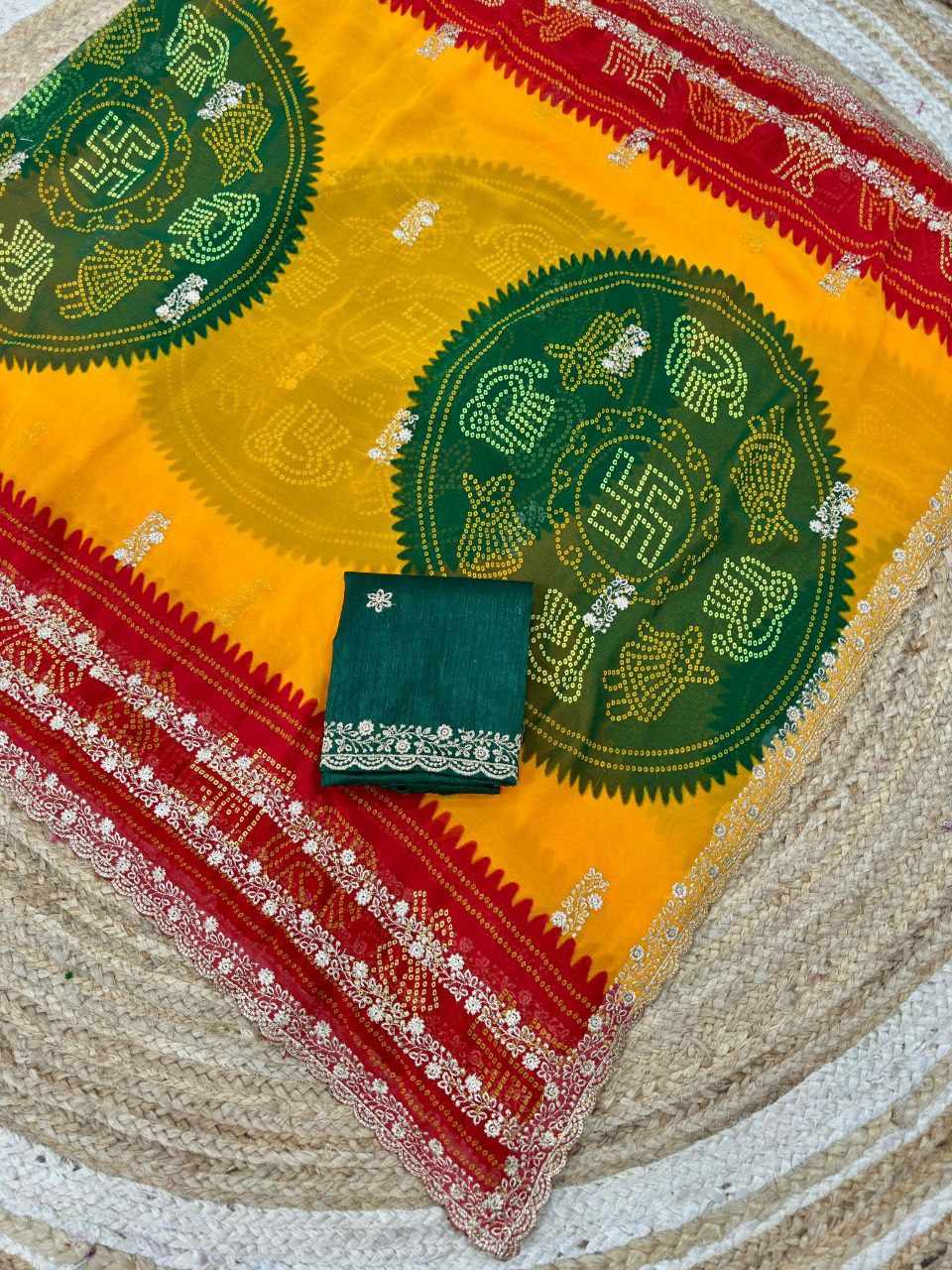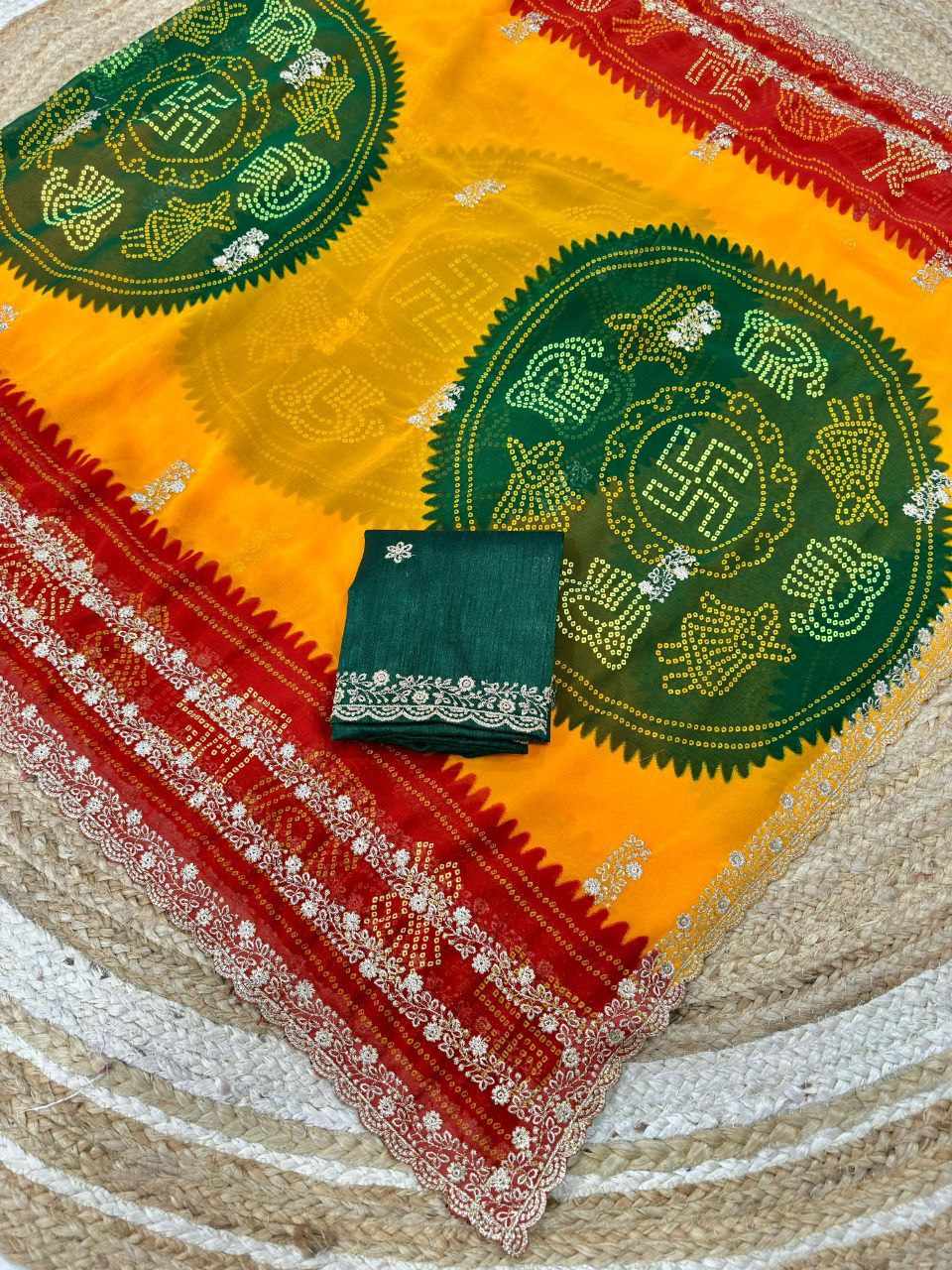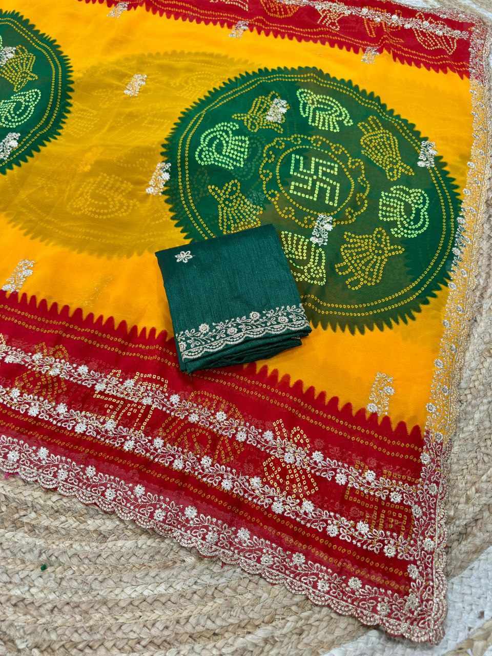 | Name : | PIYU P1052 LEHERIYA BANDHANI-1 Yellow-Red Saree |